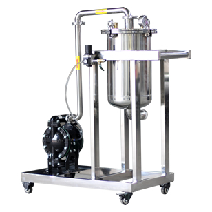 移動式袋式過濾器包括了一個不銹鋼袋式過濾器、氣動隔膜泵、氣源二聯件、單氣控閥,裝置在手推車上,可隨意移動至任何生產線上進行工作。袋式過濾系統(tǒng)是一種新型的過濾系統(tǒng),過濾機內部由金屬網籃支撐濾袋,流體由入口流進,經濾袋過濾后從出口流出,雜質被攔截在濾袋中,更換濾袋后繼續(xù)使用。主要用于過濾產品的雜質,帶壓力監(jiān)測表,當壓力過大提醒更換濾袋。