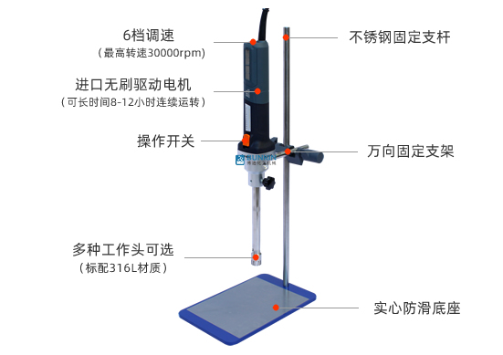 高剪切分散乳化機(jī)集靈巧、方便于一身??墒殖植僮鳌_x用德國原裝無刷大功率馬達(dá),無刷電機(jī),運(yùn)行更穩(wěn)定,噪聲更小,可處理更大范圍粘度物料。轉(zhuǎn)速可達(dá)30000rpm,可長時(shí)間8-12小時(shí)連續(xù)運(yùn)轉(zhuǎn),多種工作頭可供選擇,輕松滿足多種高要求分散、乳化、均質(zhì)的實(shí)驗(yàn)要求 。