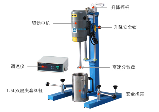 設(shè)備帶有鎖緊及升降手柄,能夠快速升降和固定;分散盤采用內(nèi)六角螺栓與主軸固定,能夠方便快速拆卸更換,清洗容易;帶有夾桶裝置,可以快速將攪拌桶固定,防止桶在工作中發(fā)生位移造成安全事故。