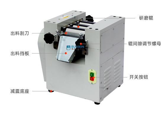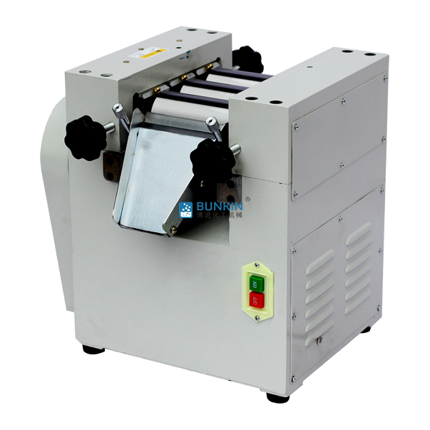 實驗室三輥研磨機由三個輥筒組成,裝在一個機架上,由電動機直接帶動。一般輥筒間的轉(zhuǎn)動方向不同,前輥向前轉(zhuǎn)動,中輥向后轉(zhuǎn)動。輥子轉(zhuǎn)速前輥快、后輥慢。中間輥固定,前后兩輥裝在滑道上,有彈簧裝置,用手輪調(diào)節(jié)前后輥與中輥的距離。物料由后輥與中輥之間進入,受到輥筒的擠壓,產(chǎn)品顆粒變細,然后由快輥帶出,快輥末端裝有刮刀,使物料與輥筒分離,落入收集桶內(nèi)。