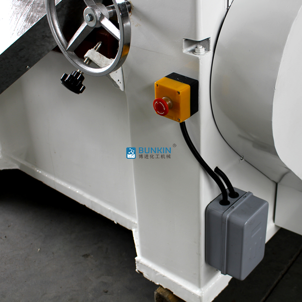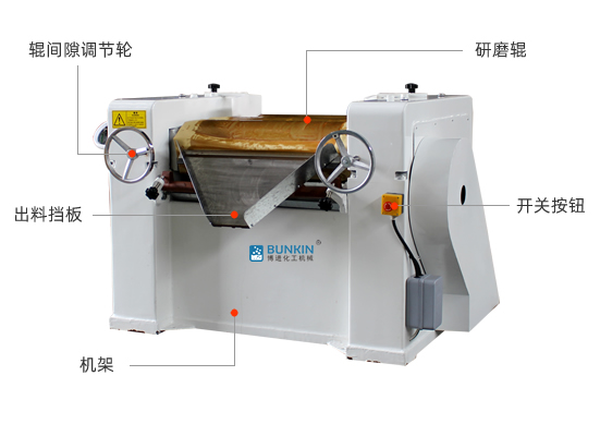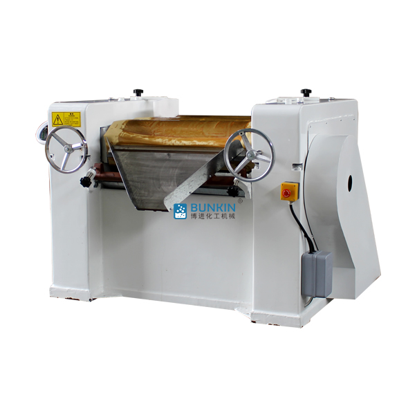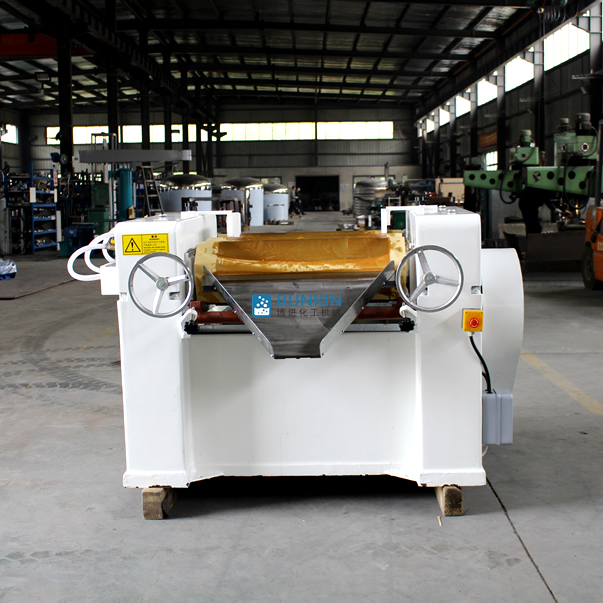 三輥研磨機由三個輥筒組成,裝在一個機架上,由電動機直接帶動。一般輥筒間的轉(zhuǎn)動方向不同,前輥向前轉(zhuǎn)動,中輥向后轉(zhuǎn)動。輥子轉(zhuǎn)速前輥快、后輥慢。中間輥固定,前后兩輥裝在滑道上,有彈簧裝置,用手輪調(diào)節(jié)前后輥與中輥的距離。物料由后輥與中輥之間進入,受到輥筒的擠壓,產(chǎn)品顆粒變細,然后由快輥帶出,快輥末端裝有刮刀,使物料與輥筒分離,落入收集桶內(nèi)。