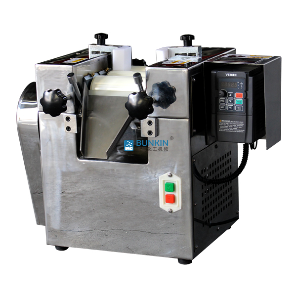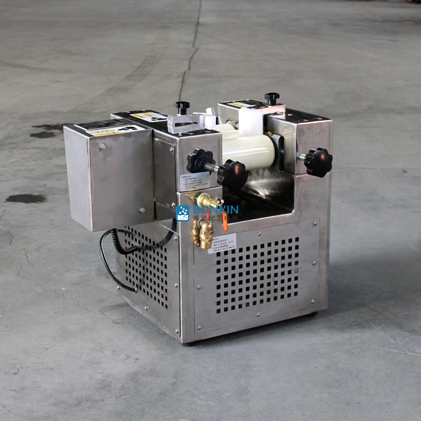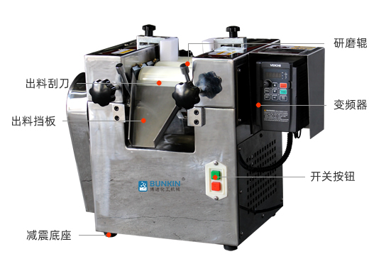 實驗室三輥研磨機由三個輥筒組成,裝在一個機架上,由電動機直接帶動。一般輥筒間的轉(zhuǎn)動方向不同,前輥向前轉(zhuǎn)動,中輥向后轉(zhuǎn)動。輥子轉(zhuǎn)速前輥快、后輥慢。中間輥固定,前后兩輥裝在滑道上,有彈簧裝置,用手輪調(diào)節(jié)前后輥與中輥的距離。物料由后輥與中輥之間進入,受到輥筒的擠壓,產(chǎn)品顆粒變細,然后由快輥帶出,快輥末端裝有刮刀,使物料與輥筒分離,落入收集桶內(nèi)。