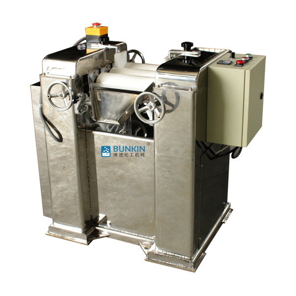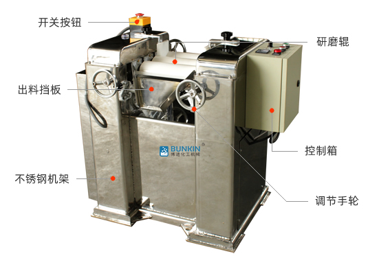三輥研磨機(jī)由三個(gè)輥筒組成,裝在一個(gè)機(jī)架上,由電動(dòng)機(jī)直接帶動(dòng)。一般輥筒間的轉(zhuǎn)動(dòng)方向不同,前輥向前轉(zhuǎn)動(dòng),中輥向后轉(zhuǎn)動(dòng)。輥?zhàn)愚D(zhuǎn)速前輥快、后輥慢。中間輥固定,前后兩輥裝在滑道上,有彈簧裝置,用手輪調(diào)節(jié)前后輥與中輥的距離。物料由后輥與中輥之間進(jìn)入,受到輥筒的擠壓,產(chǎn)品顆粒變細(xì),然后由快輥帶出,快輥末端裝有刮刀,使物料與輥筒分離,落入收集桶內(nèi)。