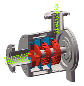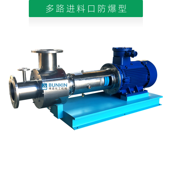 管線式三級(jí)乳化泵采用臥式結(jié)構(gòu)。在狹長(zhǎng)的工作腔內(nèi)裝有三組轉(zhuǎn)定子,轉(zhuǎn)定子可設(shè)計(jì)成三級(jí)十二層、三級(jí)十四層、三級(jí)十八層或者其它非標(biāo)結(jié)構(gòu)形式,轉(zhuǎn)定子對(duì)偶耦合,高度配合。由電機(jī)帶動(dòng)中間軸進(jìn)行高速運(yùn)轉(zhuǎn),轉(zhuǎn)定子形成真空,物料從進(jìn)口被吸入轉(zhuǎn)定子腔內(nèi),強(qiáng)大動(dòng)能使轉(zhuǎn)子產(chǎn)生極高的線速度,使物料在轉(zhuǎn)、定子間隙之間經(jīng)過(guò)強(qiáng)烈的撞擊、破碎、離心擠、液層摩擦、強(qiáng)力剪切之后飛射出去,在多種不同方向力的作用下,產(chǎn)生強(qiáng)大紊流,物料從出口流出。