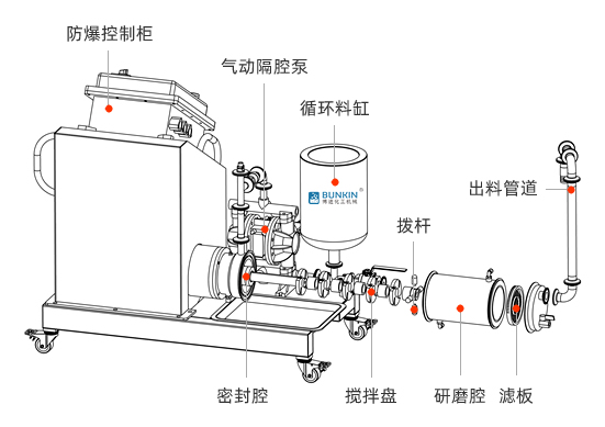 實(shí)驗(yàn)室中試臥式砂磨機(jī)的隔膜泵將喂料斗內(nèi)的物料與研磨腔形成循環(huán)研磨。研磨腔內(nèi)填充研磨介質(zhì)受到撥盤旋轉(zhuǎn)帶動(dòng)產(chǎn)生各個(gè)方向的力并不規(guī)則運(yùn)動(dòng),物料中的顆粒受到研磨介質(zhì)不斷的碰撞及摩擦,同時(shí),篩網(wǎng)使物料和研磨介質(zhì)分開(kāi),物料不斷的從料斗罐到研磨腔循環(huán)流動(dòng),實(shí)現(xiàn)粒徑變小,粒徑范圍變窄的目的。