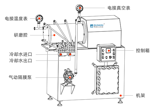 研磨腔外帶特制冷卻水夾套,在設(shè)備運(yùn)行時(shí)通水冷卻,起到很好的冷卻效果,常規(guī)溫升小于10º,設(shè)備帶有溫度和壓力監(jiān)控,能夠設(shè)定“保護(hù)值”,確保產(chǎn)品品質(zhì)。