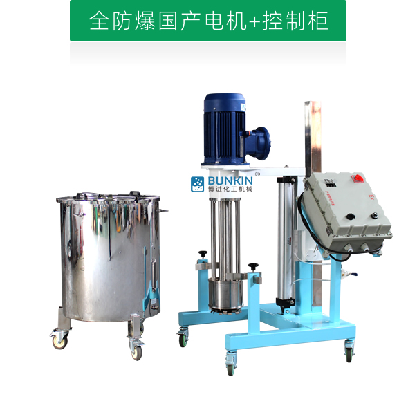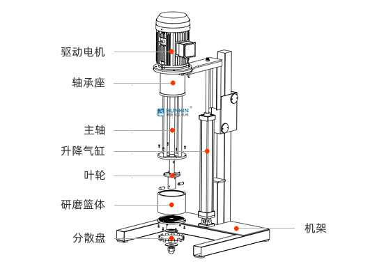 氣動升降籃式研磨機電機運轉帶動撥桿和底部分散盤高速旋轉,使分散盤上部及籃腔內(nèi)部形成真空,漿料被吸入籃式研磨腔內(nèi)。撥桿驅動腔內(nèi)的研磨介質產(chǎn)生向各個方向的力,物料中的顆粒受到介質不斷地碰撞及摩擦,粒徑變小,粒徑范圍變窄;分散盤的高速運轉,產(chǎn)生渦流將腔內(nèi)物料抽吸出來,再循環(huán)至進料,具有非常顯著的分散研磨混合效果, 通過氣閥旋轉或電磁閥點動控制實現(xiàn)氣缸工作,利用氣缸升降帶動電機及工作頭升降。
