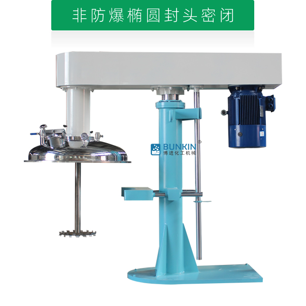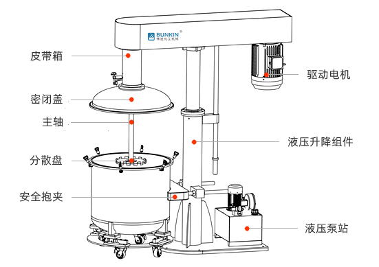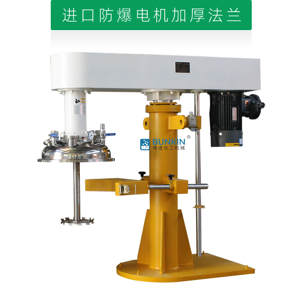 設(shè)備通過(guò)油缸作為升降執(zhí)行器,帶控制閥控制分散機(jī)上升、停止、下降,操作簡(jiǎn)單,穩(wěn)定性高;分散盤采用內(nèi)六角螺栓與主軸固定,能夠方便快速拆卸更換,清洗容易,且可以根據(jù)工藝情況更換不同的分散盤,實(shí)現(xiàn)分散效果;帶有不同的抱夾方式(皮帶、手搖、氣動(dòng)),可以快速將攪拌桶固定,防止桶在工作中發(fā)生位移造成安全事故。