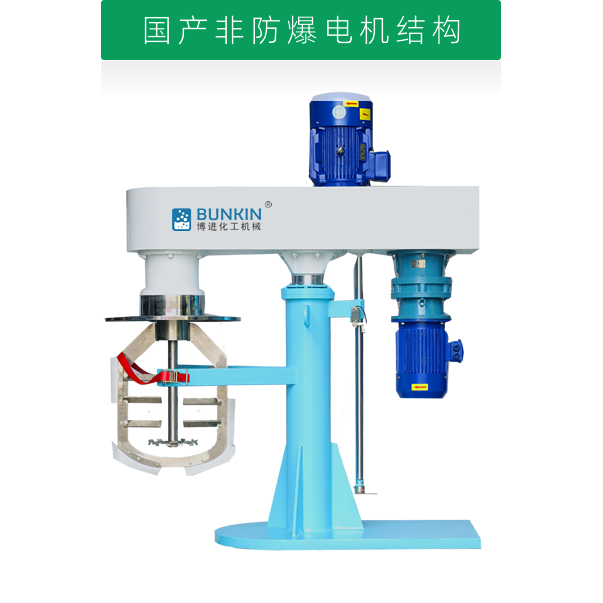 設備通過油缸作為升降執(zhí)行器,帶控制閥控制工作頭上升、停止、下降,操作簡單,穩(wěn)定性高;攪拌槳與主軸之間采用固定螺栓固定,方便拆卸更換,清洗容易;帶有不同的抱夾方式(皮帶、手搖、氣動),可以快速將攪拌桶固定,防止桶在工作中發(fā)生位移造成安全事故。