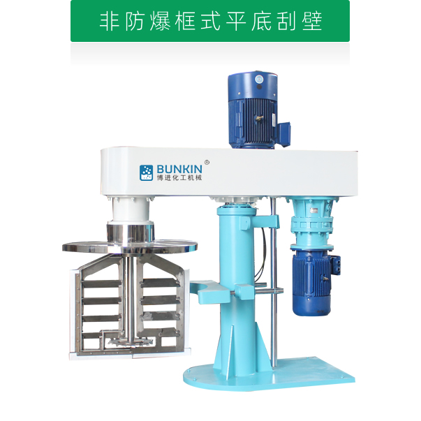 在攪拌器上裝有刮刀,緊貼桶壁刮拭,桶壁經(jīng)立車精加工后,再經(jīng)自動拋光機拋光,確?;顒庸蔚对谛D(zhuǎn)時把桶壁的物料完全刮掉,使桶壁無滯留料,提高混合效果。