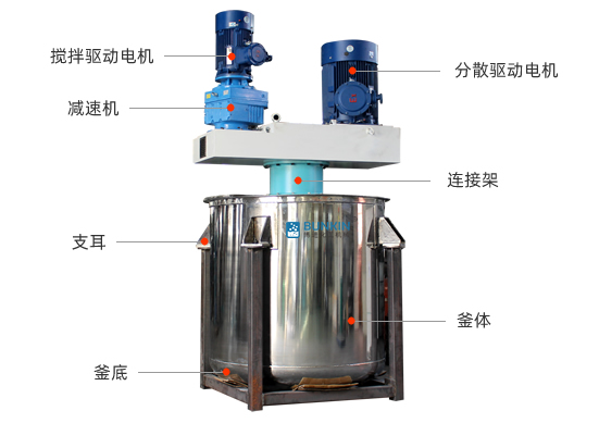 同心雙軸分散攪拌釜攪拌漿葉在動力機組的驅(qū)動下,沿固定方向旋轉(zhuǎn);在旋轉(zhuǎn)過程中,驅(qū)使物料做軸向旋轉(zhuǎn)和徑向旋轉(zhuǎn)。攪拌機內(nèi)的物料,同時存在軸向運動和圓周運動,因而同時存在剪切攪拌和擴散攪拌等幾種攪拌形式。在攪拌槳上裝有刮刀,緊貼桶壁刮拭,刮刀隨著攪拌器旋轉(zhuǎn)時把桶壁的物料完全刮掉,使桶壁無滯留料,同時提高混合效果。分散盤通過高速運轉(zhuǎn),使物料呈環(huán)狀流,產(chǎn)生強旋渦,呈螺旋狀下降到渦流底部。粒子間產(chǎn)生強烈的剪切撞擊與磨擦,達到迅速分散、溶解功能。攪拌盤通過圓周運動,產(chǎn)生較好的徑向作用里,加速物料循環(huán),提高分散效率。