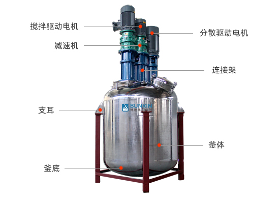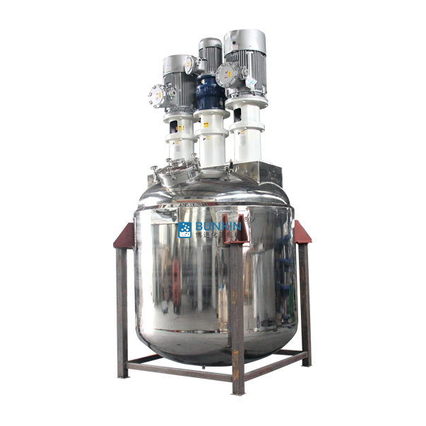 三軸多功能反應(yīng)釜由帶刮壁式攪拌器和高速分散器(乳化頭或研磨頭)組成,三組攪拌器同時作業(yè)使物料受到強(qiáng)烈的分散、混合作用,達(dá)到快速混合的目的;攪拌器一般分為錨式和蝶式兩種,針對不同粘度、比重的物料和不同的生產(chǎn)工藝要求可以設(shè)計(jì)較好攪拌形式。