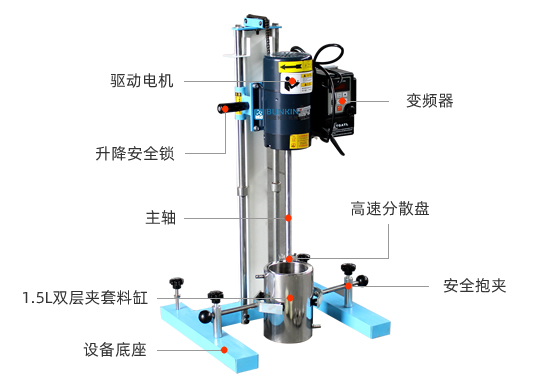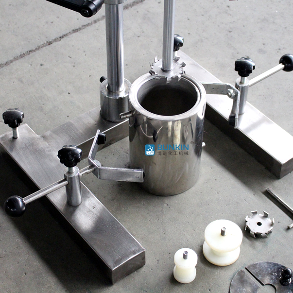 設(shè)備帶有鎖緊及升降手柄,能夠快速升降和固定;分散盤采用內(nèi)六角螺栓與主軸固定,能夠方便快速拆卸更換,清洗容易;帶有夾桶裝置,可以快速將攪拌桶固定,防止桶在工作中發(fā)生位移造成安全事故。